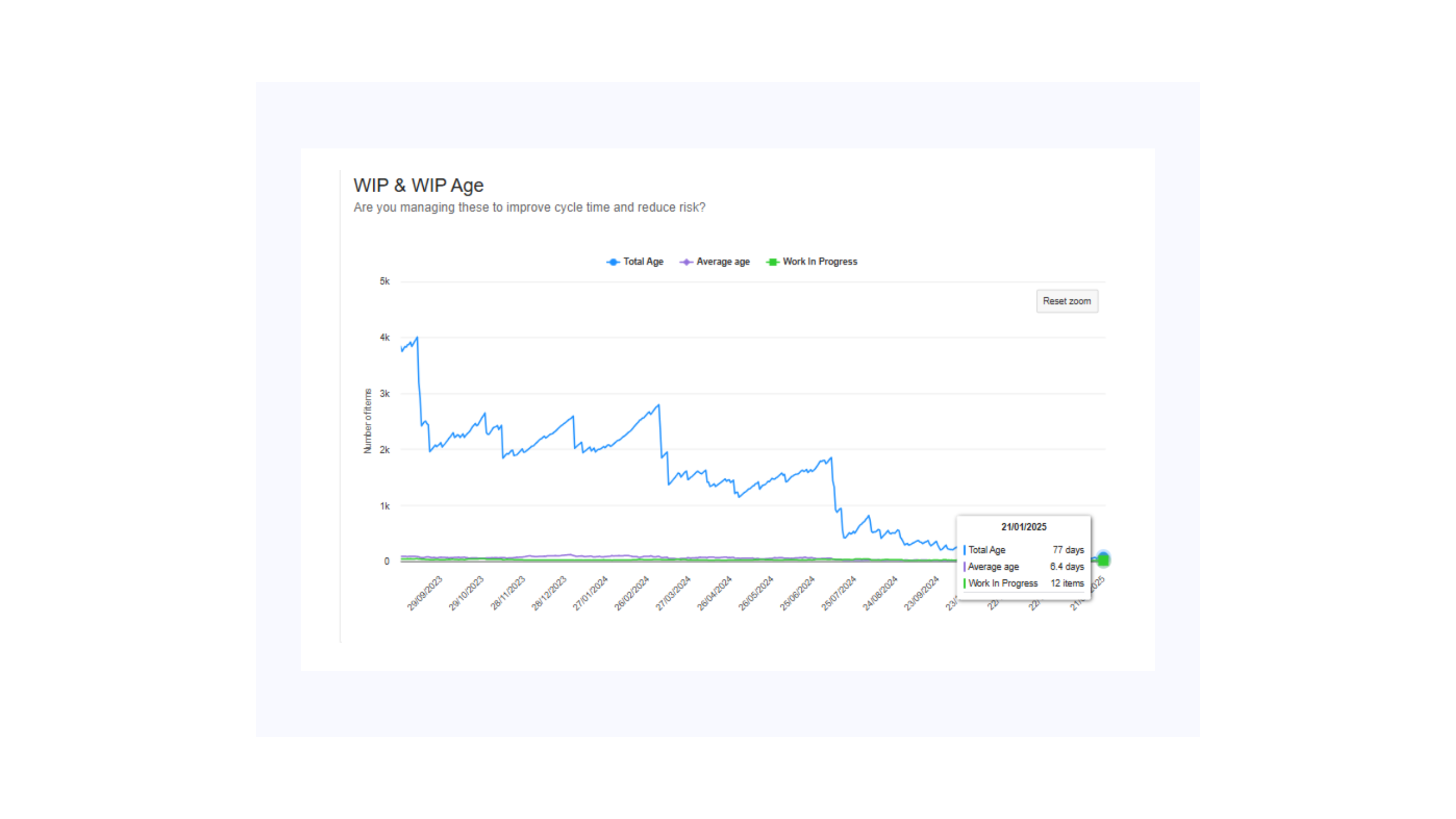 The results were dramatic. Today, the team has reduced their work-in-progress to 12 items with a total age of only 77 days.