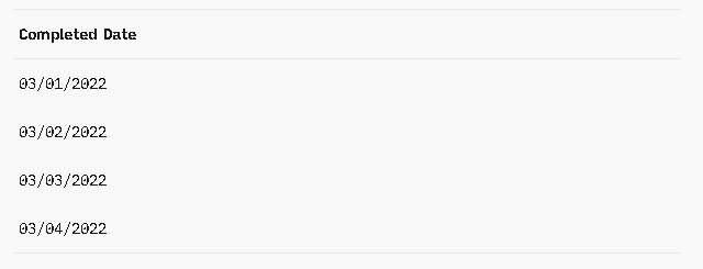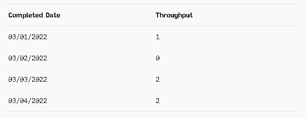 To calculate Throughput, begin by noting the earliest date that any item was completed, and the latest date that any item was completed. Then enumerate those dates. In our example, those dates in sequence are: