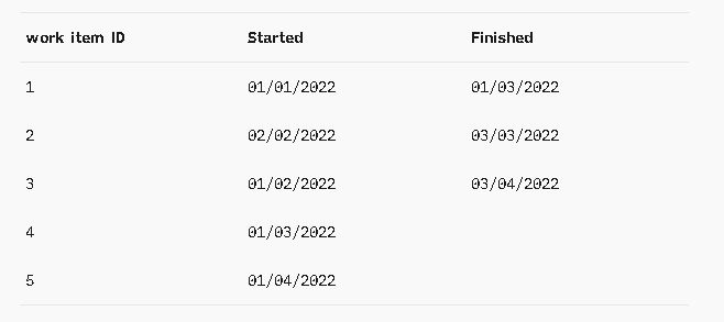 The definitions are great but are, unfortunately, meaningless unless we know what data we need to capture to calculate them. In terms of data collection, this is where our harping on you to define started and finished points will finally pay off. Take a timestamp when a work item crosses your started point and take another timestamp when that same work item crosses your finished point. Do that for every work item that flows through your process as shown below (forgive the American-style dates):