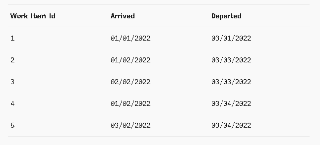 WIP is the count of all work items that have a started timestamp but not a finished timestamp for a given time period. That last part is a bit difficult for people to grasp. Although technically, WIP is an instantaneous metric--that is, at any time you could count all of the work items in your process to calculate WIP--it is usually more helpful to talk about WIP over some time unit: days, weeks, Sprints, etc. Our strong recommendation--and this is going to be our strong recommendation for all of these metrics--is that you track WIP per day. Thus, if we would want to know what our WIP was for a given day, we would just count all the work items that had started but not finished by that date. For the above picture, our WIP on January 5th is 3 (work items 3, 4, and 5 have all started before January 5th but have not been finished by that day).