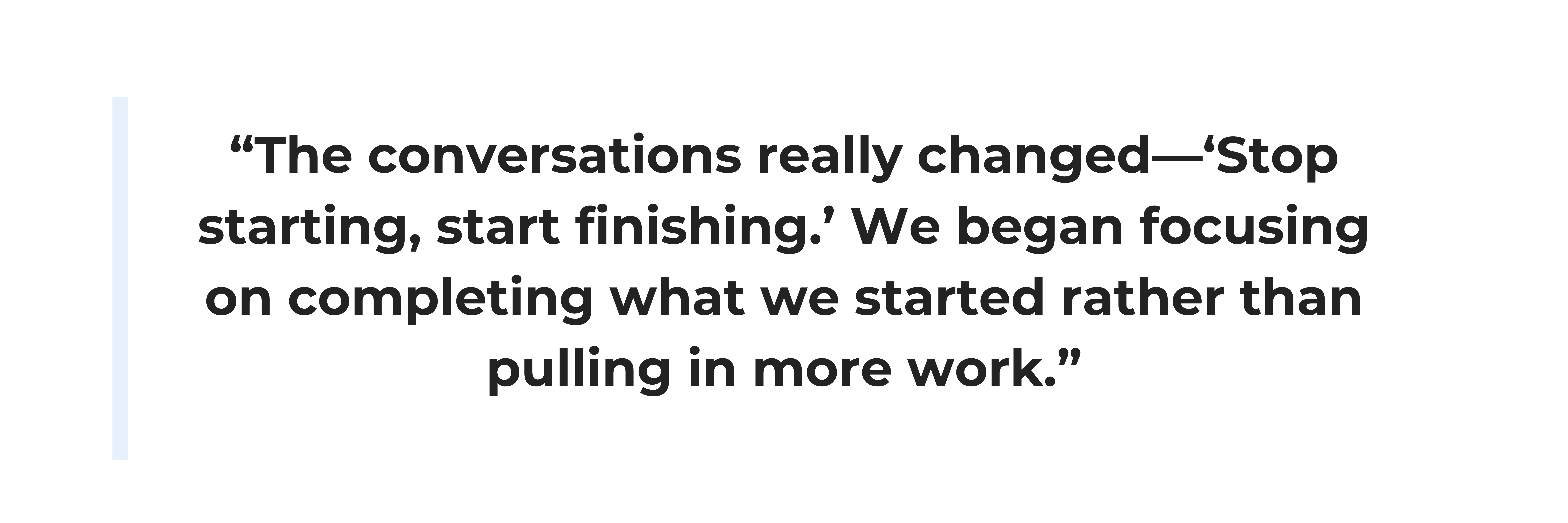 The cultural shift toward completing work rather than starting new tasks has been a standout result of using ActionableAgile® Analytics. Susan noted the change in team conversations: “Stop starting, start finishing. That became the focus. It was really positive to see tech leads and team members championing this mindset.”