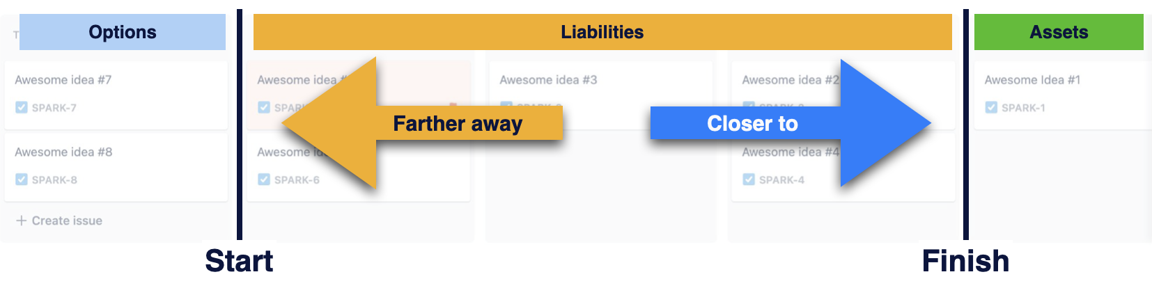 Once you can truly say that you have modeled the life cycle of turning options into assets, you can say that a card's position in the workflow reflects how close or far away it is from realizing its potential value.